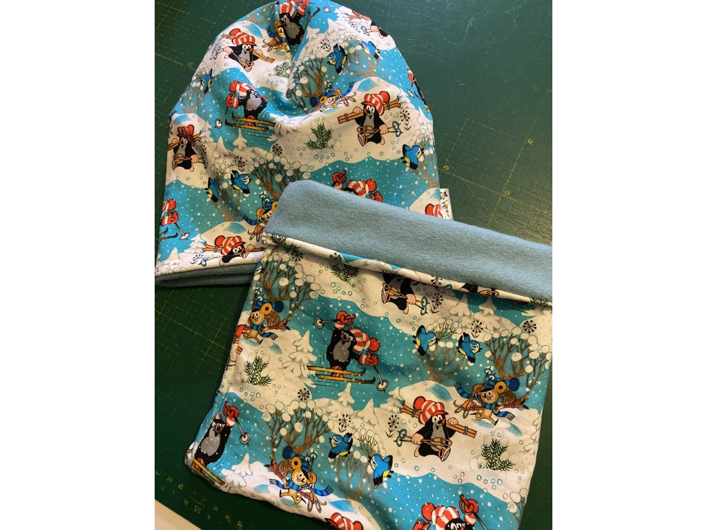 Zimní sety čepice a nákrčník se vzorem krtečka jsou vzor - teplákovina a rub hřejivý flecee